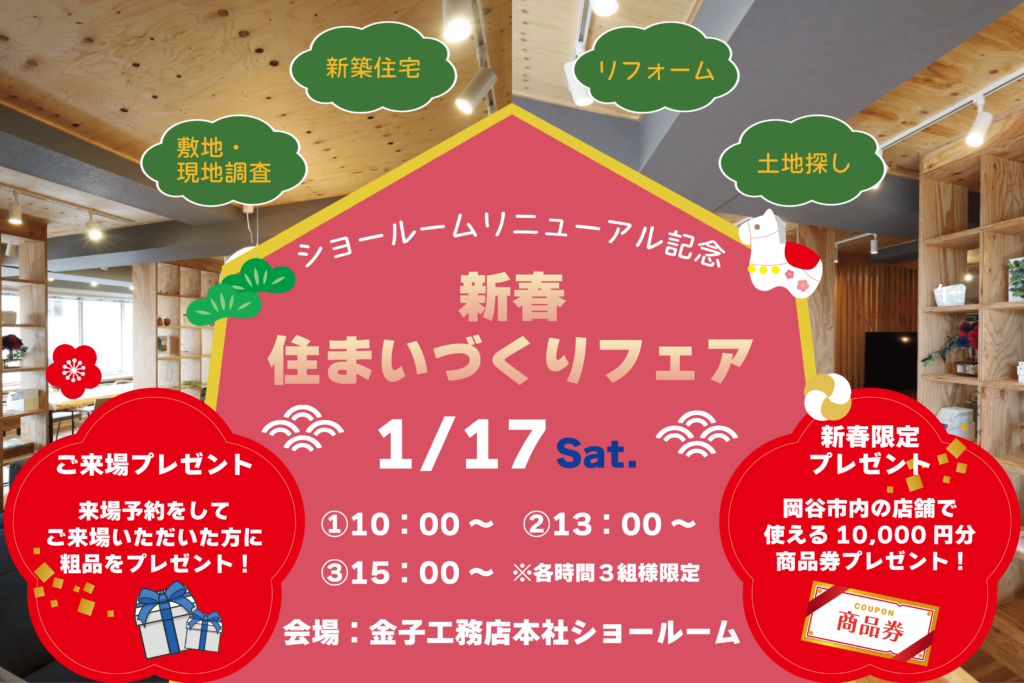 新しい年の始まりに、住まいのことを考えてみませんか!! 新春のお慶びを申し上げます。 弊社は昨年末にショールームを大規模リフォームしました!木の温もりを感じる居心地の良い空間になっております。 今回は、リニューアル記念として〈新春住まいづくりフェア〉を開催します!「いつかは」と思っていたマイホームの夢を一歩進めてみましょう。経験豊富な家づくりのプロと気軽に話…