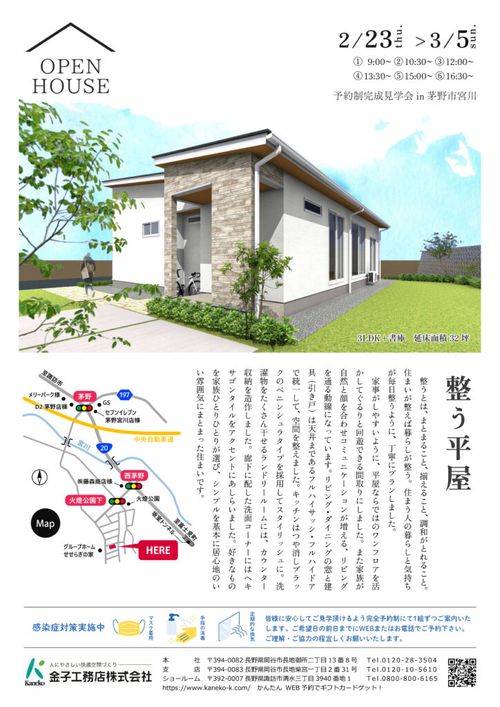 【整う平屋 完成見学会】開催期間│2/23(木)~3/5(日)会場│茅野市宮川