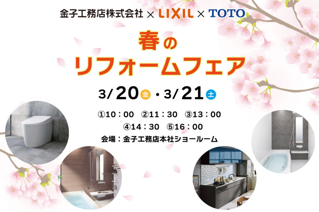 金子工務店株式会社×LIXIL×TOTOの3社コラボイベント『春のリフォームフェア』を開催します。リフォームをご検討中の方に、LIXILとTOTOの充実した商品ラインナップをフェア限定価格でご案内できるイベントになっております。 来場特典をご用意してお待ちしております!お気軽にお申し込みください! 開催日│3月20日(金)・21(土)時間│①10:00 ②1…