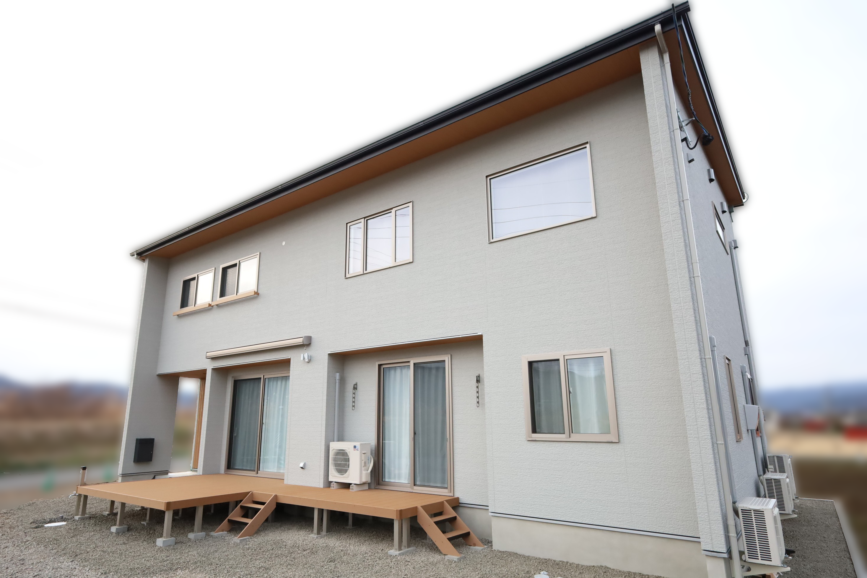 ウッドデッキが特徴的な玄関共有の二世帯住宅。