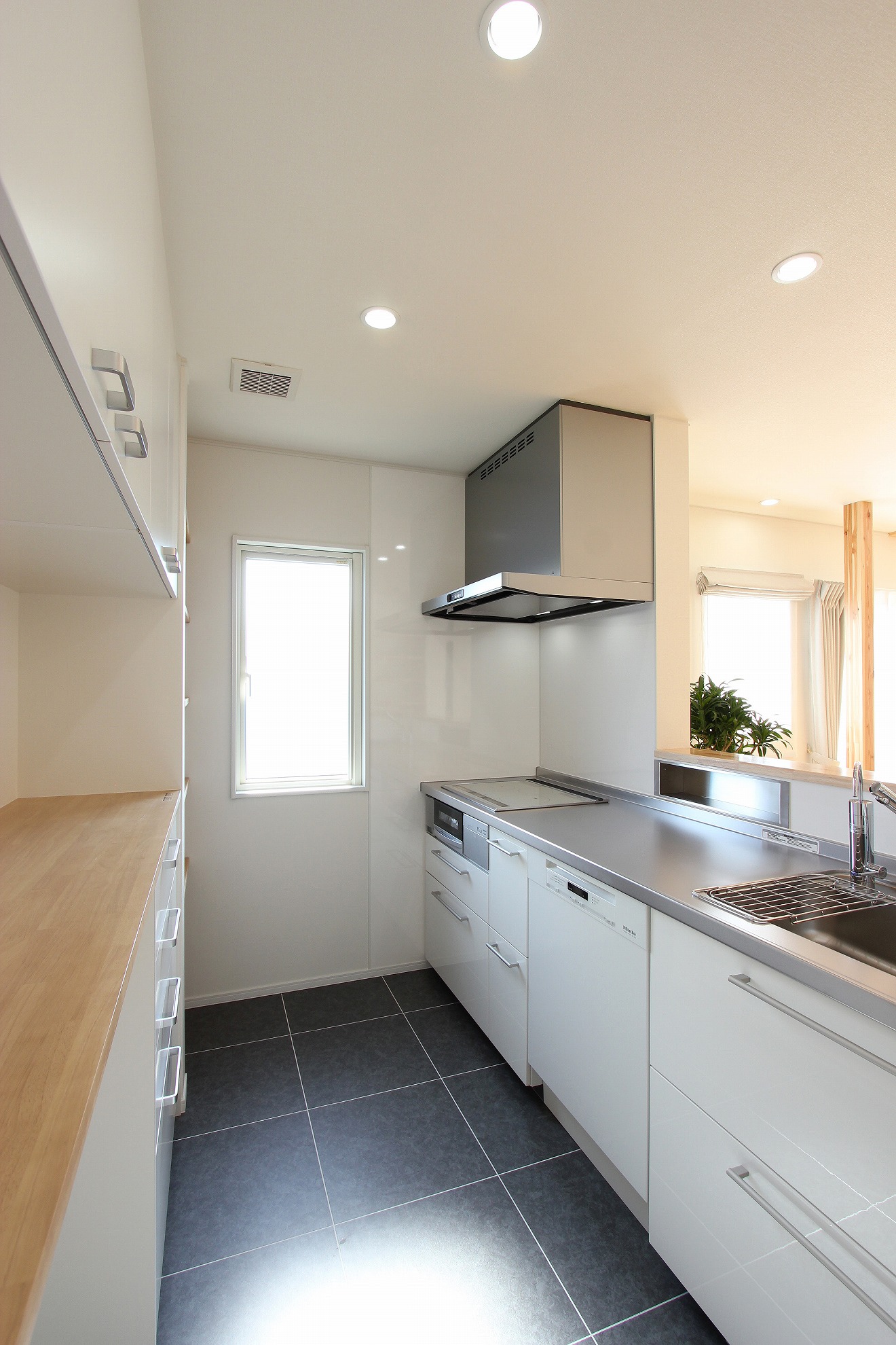 回遊する家事動線とただいま動線によって家事を効率よくかつお子様の『自分で出来る』を伸ばす、子育て世帯の住まいです。無垢の柱や桧材をふんだんに使い、ぬくもりのある空間となっています。リビングの一部を吹き抜けにして、オープンタイプの階段下はテレビコーナーとしました。小上がりの和室はお昼寝や来客時のお部屋としても活躍します。キッチンの床はシックでモダンなフロアタイルを採用しました。キッチンに立つ時間が楽しみになることでしょう。家事時短アイテムの頼もしい味方は大容量のドイツ製食洗機・ミーレ。洗濯脱衣室には予洗い用の流しと洗濯乾燥機を設置します。ワークスペースのある2階ホール・フリースペース~ウォークインクローゼットまで建具のない空間を設け、居室以外に多用途に使えるフレキシブルなスペースが充実しています。大工のお父様による匠の技、格式高い和室の格天井(ごうてんじょう)や木製手摺、スライド本棚など家族への愛情が形となって散りばめられています。空調システムにはデンソーの全館空調PARADIAを採用し、24時間365日、家じゅうを快適な温度と湿度に保つことができます。